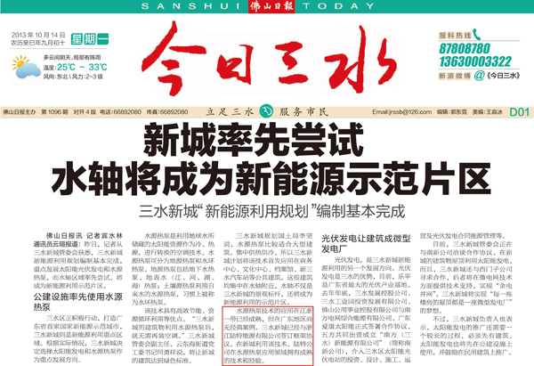 10月14日,佛山日報旗下報紙《今日三水》在頭版頭條報道了三水新城新能源利用規劃的相關新聞,稱三水新城“新能源利用規劃”編制已基本完成,將重點發展太陽能光伏發電和水源熱泵。報道特別指出,在水源熱泵技術方面,廣東省目前尚無經典案例,三水新城目前已與浙江陸特能源科技有限公司簽訂了框架協議,在新城利用該技術,并稱陸特公司在水源熱泵應用領域擁有成熟的技術和經驗。