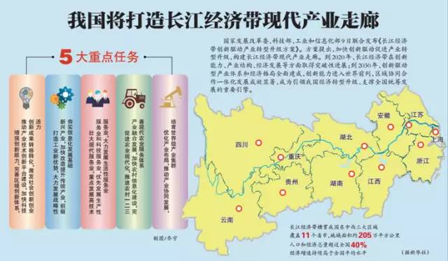 2020年在三方面取得突破性進展 創新能力大幅提升。基本實現由要素驅動向創新驅動轉變,研發投入不斷加強,專利布局不斷完善。戰略性新興產業自主創新能力全面提升,新一代信息技術、生物、高端裝備繼續保持領先水平,節能環保、新材料、新能源、新能源汽車與發達國家差距大幅縮小。突破一批關鍵核心技術,獲得一批重要技術專利,創新成果顯著增加。形成若干世界級產業集群和具有國際先進水平的產業基地,打造一批創新型領軍企業。 產業結構明顯優化。產業空間布局更加合理,生產要素實現區域內自由、合理流動,下游地區高端產業、科技資源、人才要素優勢更為突出,中上游地區承接產業轉移規模進一步擴大,東中西協同發展的格局基本形成。產業結構調整和轉型升級效果明顯,信息化與產業融合發展水平顯著提升,現代服務業和高技術服務業比重持續提高,制造業在全球價值鏈中的整體地位大幅提升,現代農業和特色農業快速發展。 對全國經濟帶動作用進一步增強。經濟總量占全國比重穩步上升,對全國的輻射帶動示范作用進一步顯現。消費在全國經濟發展中作用進一步增強,居民消費水平穩步提高,消費結構更趨合理。外向型經濟快速發展,出口產品規模持續擴大,涌現一批具有國際影響力的品牌,國際分工地位顯著提升。 《方案》提出,到2030年,創新驅動型產業體系和經濟格局全面建成,創新能力進入世界前列,區域協同合作一體化發展成效顯著,成為引領我國經濟轉型升級、支撐全國統籌發展的重要引擎。 明確五方面重點任務 同時,《方案》明確了長江經濟帶在增強創新能力、打造工業新優勢、壯大現代服務業、促進農業現代化、優化產業布局等五方面重點任務,繼續保持新一代信息技術、生物、高端裝備等領域領先水平,在節能環保、新材料、新能源、新能源汽車等領域大幅縮小與發達國家間的差距。 在增強創新能力方面,要不斷完善區域創新體系,推動產業技術創新平臺建設,加快科技創新成果轉移轉化,激發社會創新創業活力。 在打造工業新優勢方面,大力發展戰略性新興產業,結合《中國制造2025》戰略,瞄準未來產業競爭制高點,加快發展高端裝備制造、新一代信息技術、節能環保、現代生物、新材料、新能源、新能源汽車等戰略性新興產業,著力提升技術研發水平,推動產業轉型升級和結構調整。加快改造提升傳統產業,加快鋼鐵、有色金屬、石化、紡織等領域技術改造,提高傳統產業競爭力,提升重點行業清潔生產水平,淘汰落后產能。發展“互聯網+”協同制造新模式,在重點領域推進智能制造、大規模個性化定制、網絡化協同制造和服務型制造,提升資源使用效率。積極夯實信息化發展基礎,加快“寬帶中國”戰略實施,推進光纖寬帶網絡建設,城市新建區域推動光纖到戶,已建區域加快光纖化改造進程,統籌提高寬帶網絡接入能力和普及水平。 在壯大現代服務業方面,要重點發展高技術服務業和科技服務業,優先發展生產性服務業,大力發展生活性服務業。 在促進農業現代化方面,推進農村一二三產業融合發展,加快農村信息化建設,完善現代農業服務體系。 在優化產業布局方面,推動產業協同發展,以產業鏈為整體,加強上中下游產業互動,推進區域協同發展。發揮上中下游各自優勢,推動建立科學合理、分工協作的產業布局。結合重大生產力布局規劃、主體功能區定位,堅持政府引導和市場機制相結合、產業轉移與升級相結合、優勢互補與互利共贏相結合、資源開發與生態保護相結合,創新園區合作管理模式和運作機制。培育世界級產業集群,培育一批具有國際競爭力的本土跨國企業和專精特新的中小企業,形成骨干企業領軍、中小企業配套協同發展的良好產業生態體系,培育十大新興產業集群。 長江經濟帶橫貫我國東中西三大區域,覆蓋湖北等11個省市,地域面積約205萬平方公里,人口和經濟總量超過全國40%,經濟增速持續高于全國平均水平,經濟帶動作用強、輻射范圍廣,是全球重要的內河經濟帶,在我國發展大局中具有舉足輕重的戰略地位。 《方案》要求,長江經濟帶各省市要切實履行職能,加強對方案實施的組織領導,研究支持長江經濟帶創新驅動產業轉型升級的具體措施,在有關重大改革、規劃編制、政策實施、項目安排、體制創新等方面給予積極支持。